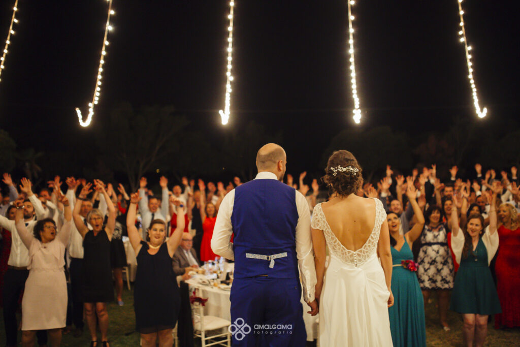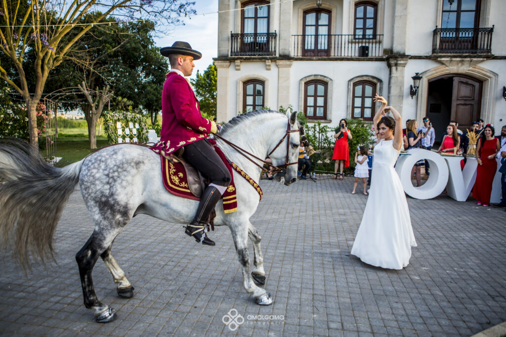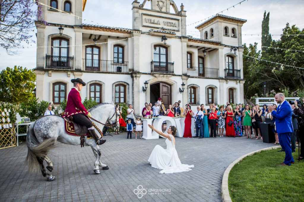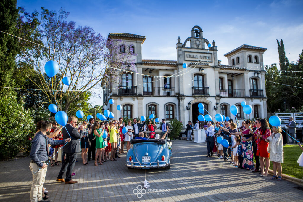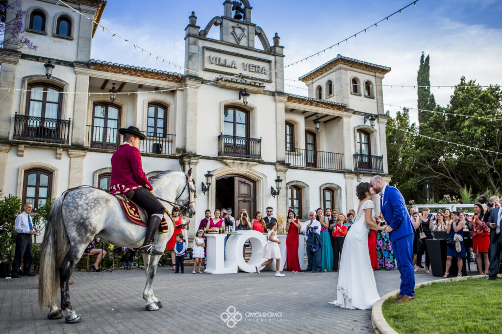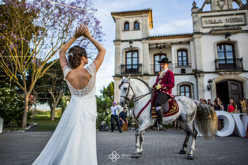 Una vez en Finca Villa vera los novios hicieron su entrada bajo una fila de globos azules que los invitados fueron soltando a su paso. La novia sorprendió al novio con un baile muy especial acompañada por un caballo. Una velada bajo la luz de las verbeneras de este precioso lugar que compartieron hasta altas horas.