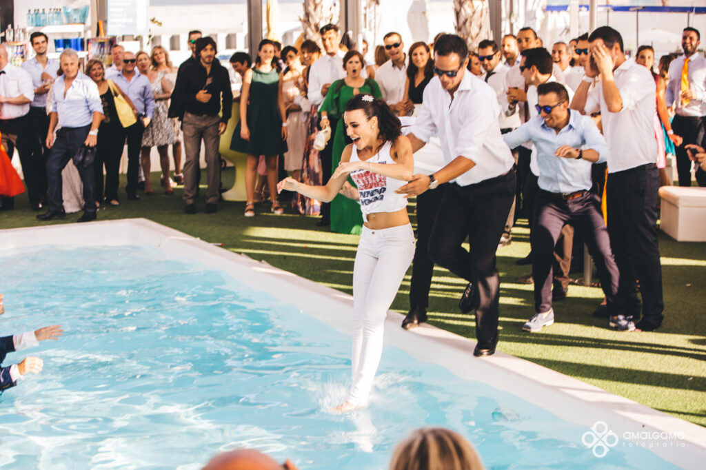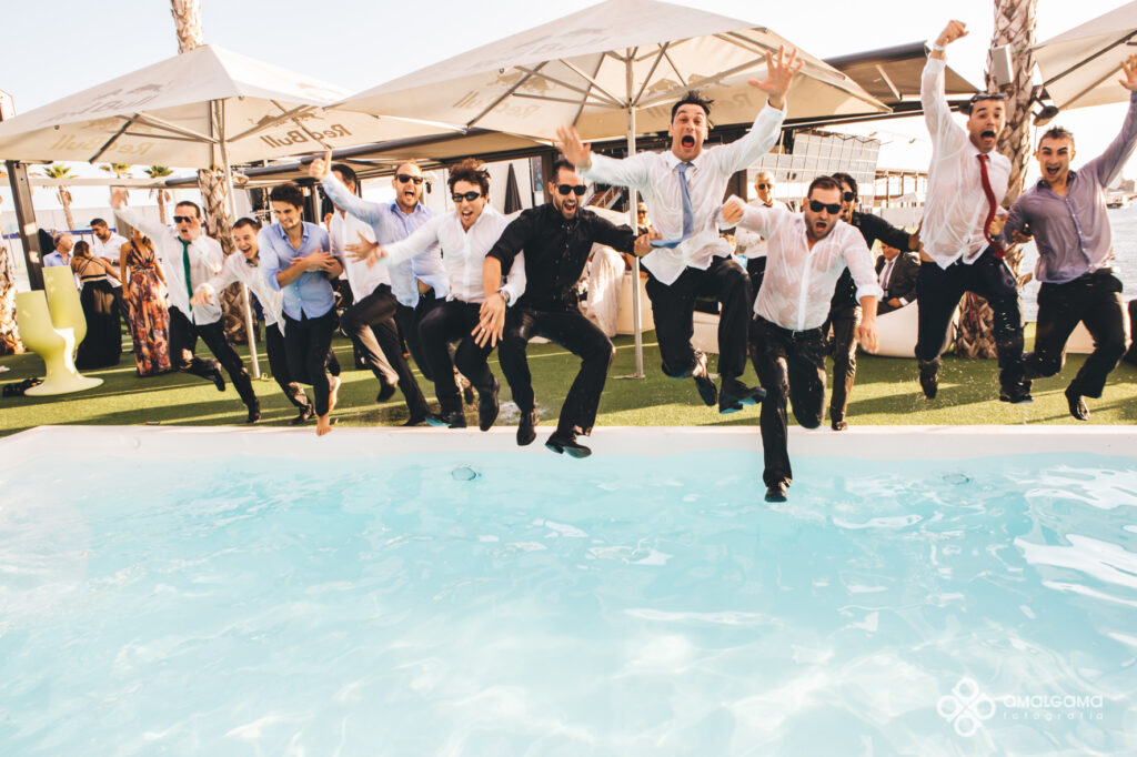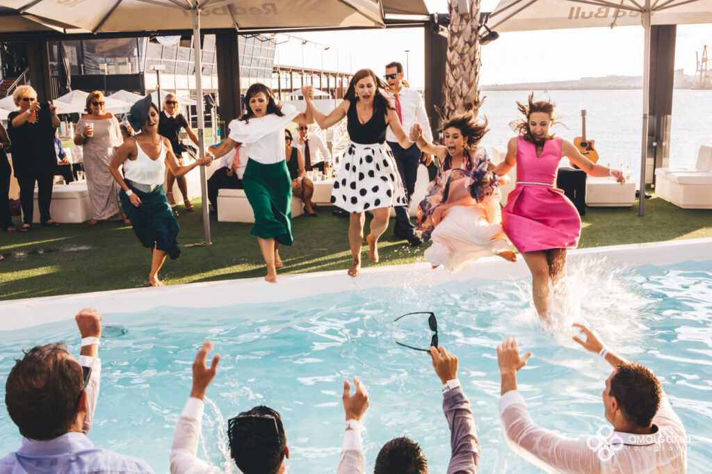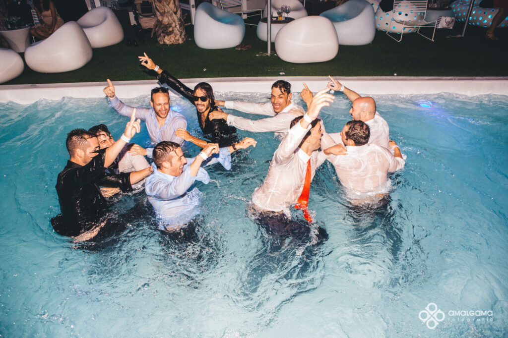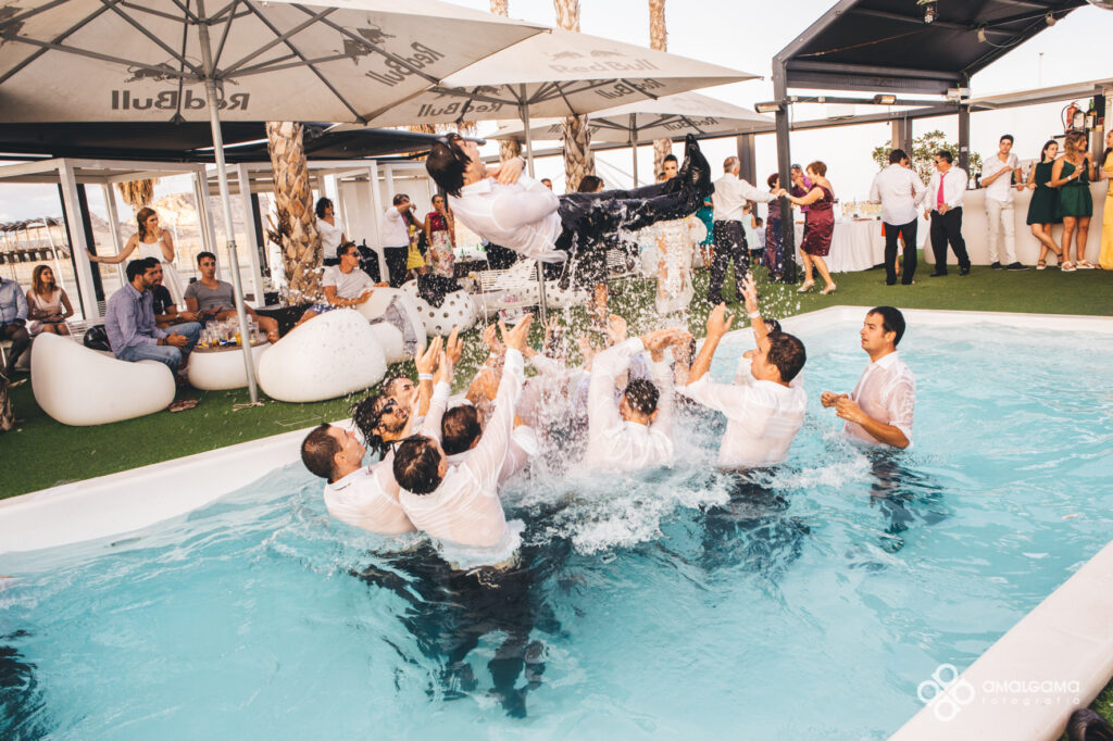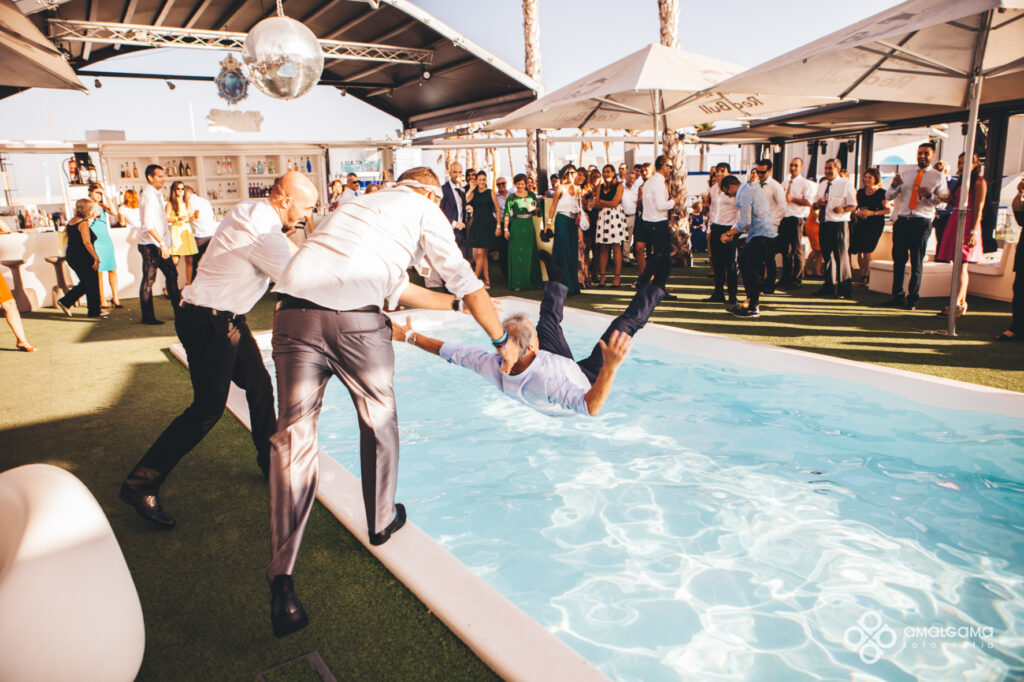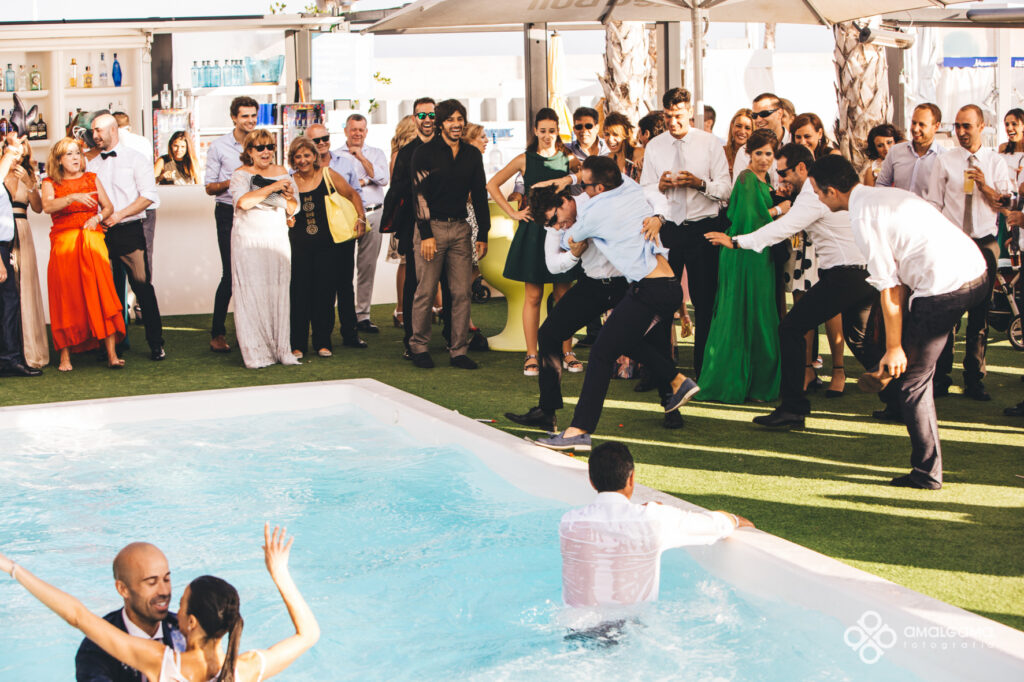 Después los invitados demostraron que la frase «a que no hay huevos…» es cierta, eso hace que nos animemos a hacer locuras como esta, tirarse vestidos a la piscina, una locura de la que sacamos fotos tan divertidas como estas. Sin duda la piscina fue el punto central de esta boda pasada por agua donde todos se lo pasaron en grande. No hay más que verlo. Locuras que dan vida y hacen recordar grandes momentos.