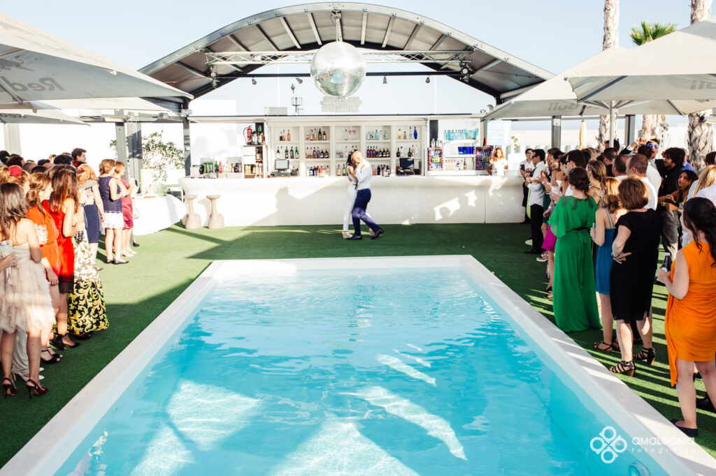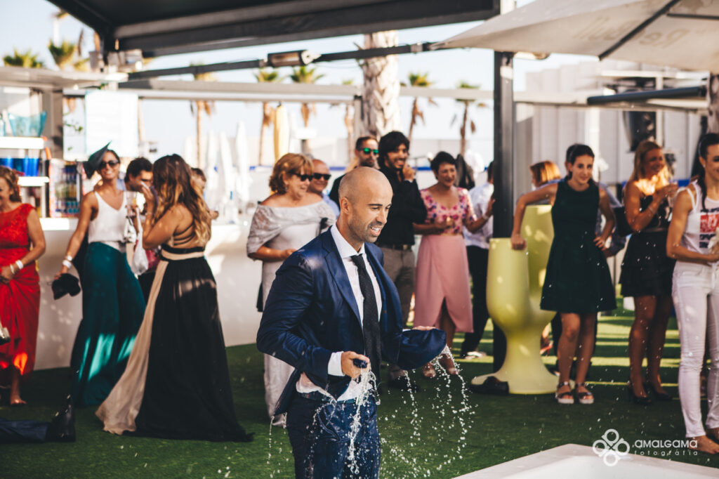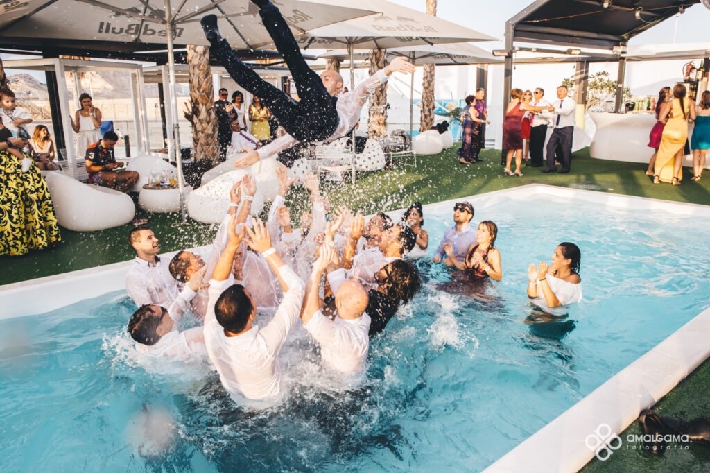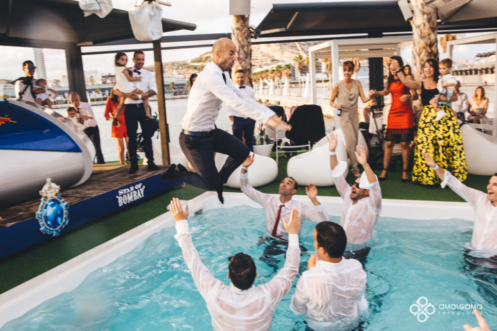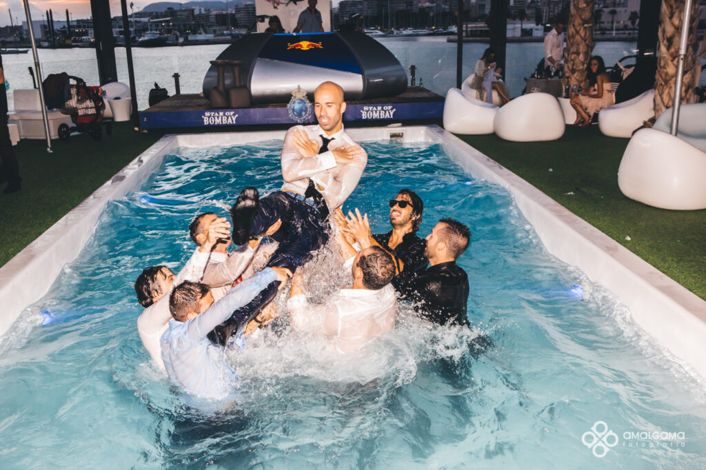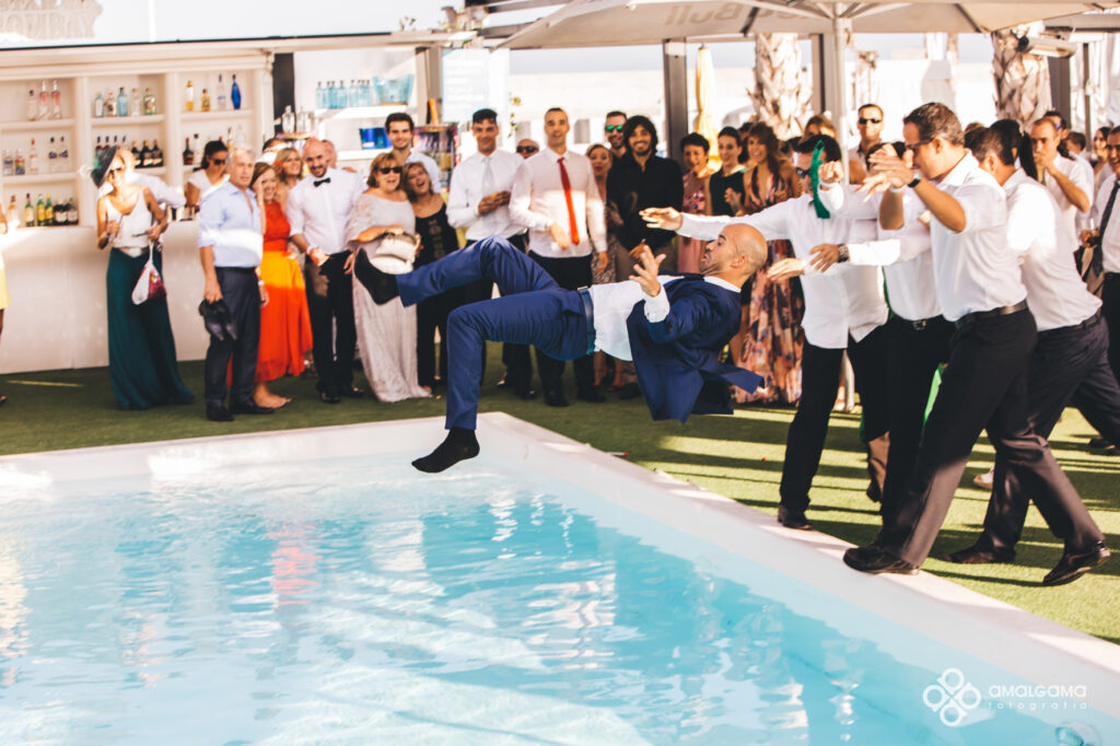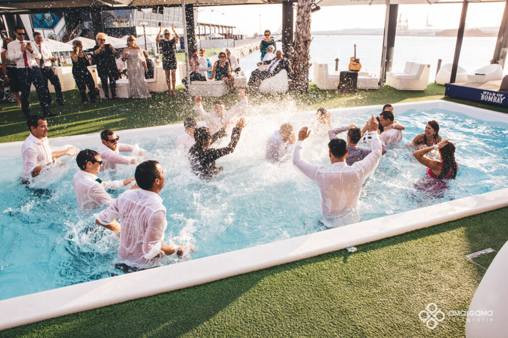 Después los invitados demostraron que la frase «a que no hay huevos…» es cierta, eso hace que nos animemos a hacer locuras como esta, tirarse vestidos a la piscina, una locura de la que sacamos fotos tan divertidas como estas. Sin duda la piscina fue el punto central de esta boda pasada por agua donde todos se lo pasaron en grande. No hay más que verlo. Locuras que dan vida y hacen recordar grandes momentos.